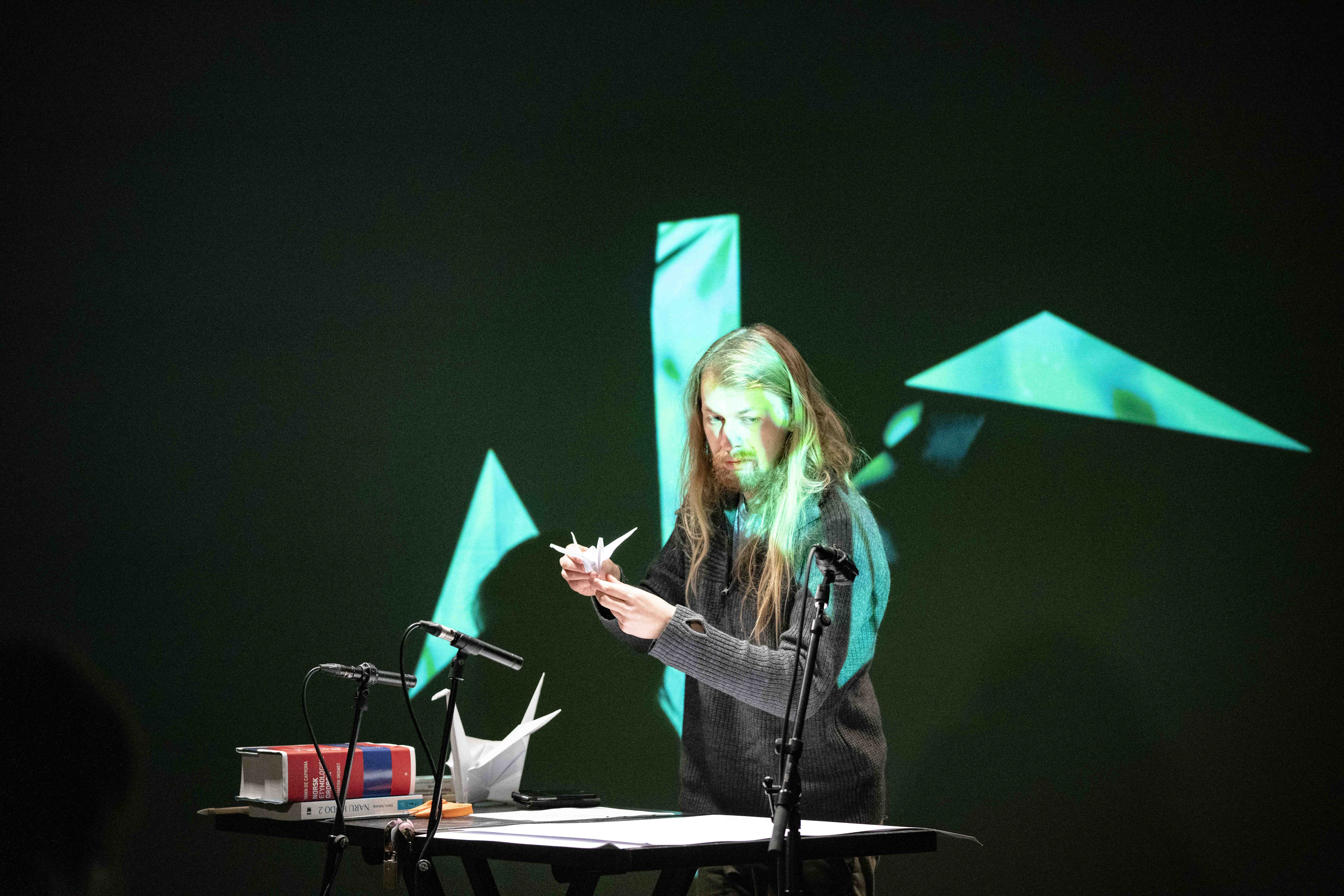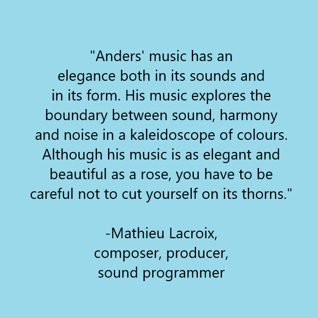 Anders Hannevold is a composer and performer with a great care for musical details, but writes music with deep conceptual roots. His writing rarely begins with a locked musical idea, but looks more to how the music can be tailored towards a performer’s unique strengths and abilities. This often leads him to unconventional scenes, such as writing for ice skaters, creating works for paper, or indulging with rare instruments. His music draws from themes such as semantic philosophy, Mickey Mousing, and various forms of traditional Japanese art. He performs in the ensembles Ōtoro, the Reeds, and Velg Belg.